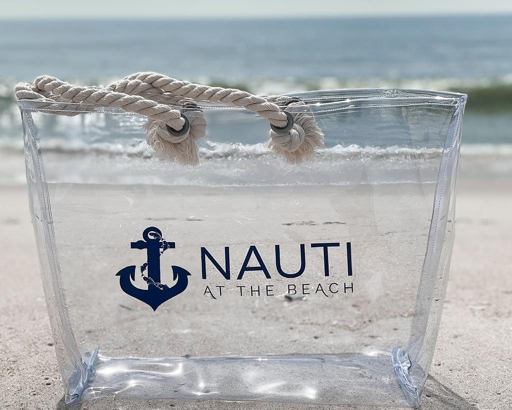 Elevate your style with the Nauti at the Beach tote. Crafted from durable, water resistant material, this oversized bag is lightweight and super durable. Toss in a perfect cozy beach towel, a durable non-toxic water bottle, a hat that protects you from the direct sun, two matching pouches for your sunglasses, sunscreen and other personal items you don’t want to get so candid with and you have "Beach in a Bag!" This versatile clear tote can be a classic staple for the beach, the farmer’s market or a daytime trip. Best part, this is a fun way to get personal by adding your own statement bag inside while leaving your items as is for an effortless vibe.